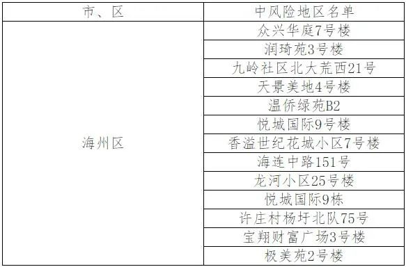 根據國務院聯防聯控機制有關規定,經綜合評估研判,市指揮部決定,自發布之日起,將龍河小區25號樓、悅城國際9棟、許莊村楊圩北隊75號、寶翔財富廣場3號樓、極美苑2號樓調整為中風險地區。