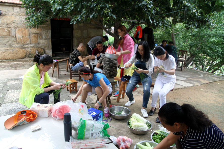這處清幽潔凈的農(nóng)家小院成了隊(duì)員大展廚藝的用武之地,大家迅速整理好自帶的蔬菜食物,按各自特長分好工。有清理蔬菜的、有和面的、有刷鍋燒水的,那些實(shí)在幫不上忙的便湊到一起圍坐在院中的樹蔭下開始“摜蛋”比賽。廚房中,面對農(nóng)戶家中的那兩口大草鍋,負(fù)責(zé)炒菜的隊(duì)員直撓頭,因?yàn)樵诔抢飳?shí)在是無處尋覓這樣的鍋灶了,更不知該如何才能把這灶火燒得旺旺的。這時(shí)我們的女隊(duì)員劉惠自告奮勇,勇敢地?fù)?dān)起了“伙頭軍”的重任。還別說,在經(jīng)過戶主老大爺?shù)囊环更c(diǎn)后,一會兒功夫這灶火便被她燒得有規(guī)有距起來。很快,灶房便飄出了炒肉、煎蛋的香味。此時(shí),院中也已擺起了包旱餃的陣式來了。面已和好,兩種口味的餡料也已備好。有負(fù)責(zé)搟餃子皮的,有負(fù)責(zé)包餃子的,隊(duì)員們賽速度、賽質(zhì)量,兩種口味的餃子被分別擺放在各自的簸箕里。看著形態(tài)各異的餃子,大家忍不住評價(jià)起來,最終有隊(duì)員被冠上了“專業(yè)面點(diǎn)師”的雅號。人多力量大,當(dāng)所有的菜肴、面點(diǎn)擺到長桌上時(shí),大家開心不已,雖然這算不上美味佳肴,但自己的勞動果實(shí)卻總是最美味。