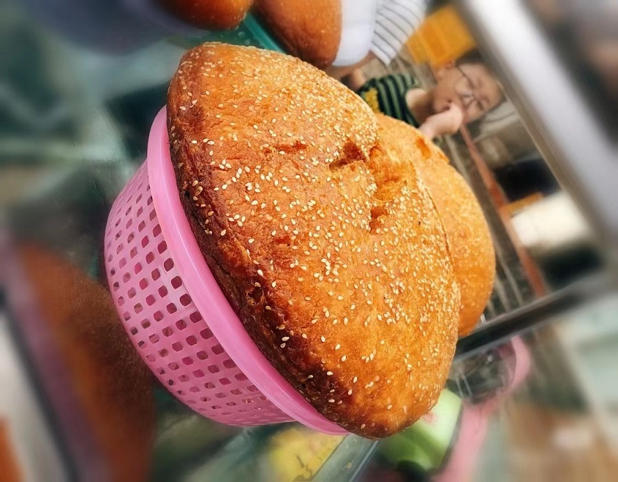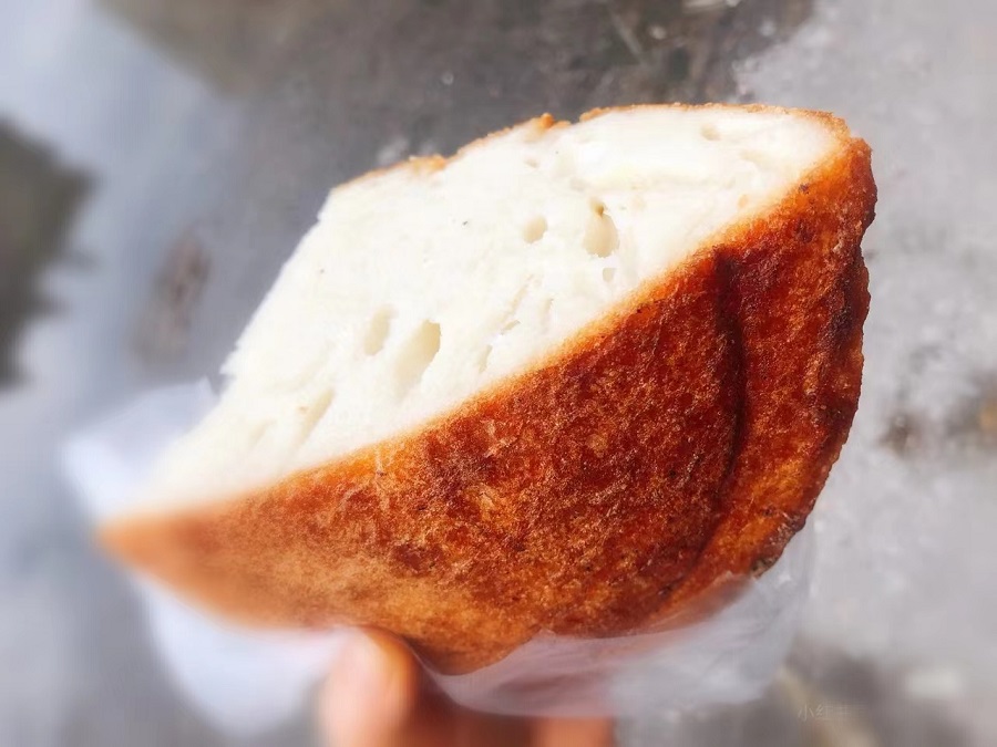 它的做法看似簡單,其實非常考量主婦的功底。面粉加入老酵,放在暖和的地方讓其自然發酵至漲滿容器。自家的土灶保持最小的火星,鍋內刷上薄薄一層油,倒入面糊。面團在鍋中慢慢膨脹,待一年微微發硬,變焦黃色,撒上一層薄薄的芝麻,刷上一層油,翻面繼續小火慢焗。看似簡單,其實沒有幾年做飯功底,還真不一定能成功。一個成功的漲燒餅,外脆里軟,內里一個個孔洞,松軟有彈性。我比較喜歡吃外皮,香脆,可口,老年人多愛吃內里,有種老酵的清香,微甜。它真的是一款老少皆宜的美味了。