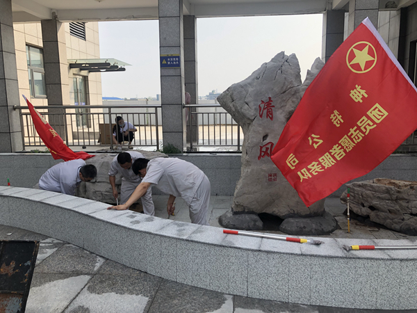 炎熱的天氣下,志愿者們不怕苦,不怕累,奮外賣力的清潔綜合辦公樓東側的廉政景觀池“清風池”。大家齊心協力,不到一小時就把“清風池”打掃得煥然一新。
