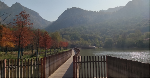 斗轉(zhuǎn)星移,山河已變,五百年前詩人所描述的風景我們無法再欣賞到,但是現(xiàn)在的園林水庫更有一番風采。火紅的水杉是她最引人注目的特色之一,寒風掠過,水杉的葉子也逐漸變成了鮮艷的火紅色,猶如一片片燃燒的火焰,在寒冷的季節(jié)中增添了一抹暖色。徜徉于火紅的水杉林,陽光下樹影婆娑,寧靜,安逸,沉醉于詩畫中。波光粼粼的湖水更是一幅美妙的畫卷,清澈透明,水草搖曳,微波蕩漾,游魚穿梭,仿佛寒冷與它們無關。棧橋嫻熟地穿越著園林與水庫,一直連接到山腳,行走其上,腳下水光瀲滟,眼前層林盡染,晴空之下無一絲塵埃,啾啾鳥鳴,沙沙葉響,嘩嘩水流,大自然的樂章歡快靜謐。
