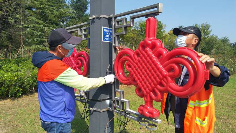 和往年一樣,今年“中秋”“國慶”兩節(jié)前夕,資源管理分公司組織公司精兵強將加入到翔立分公司兩節(jié)前道路亮化景觀突擊行動中,該公司這些志愿者隊員有的維修破損的中國結(jié)紅燈籠等亮化燈,有些負責(zé)安裝、運輸,為在節(jié)前加快完成安裝任務(wù)貢獻了自己的力量。圖為該公司志愿者在安裝自貿(mào)區(qū)主干道上的“中國結(jié)”亮化路燈。